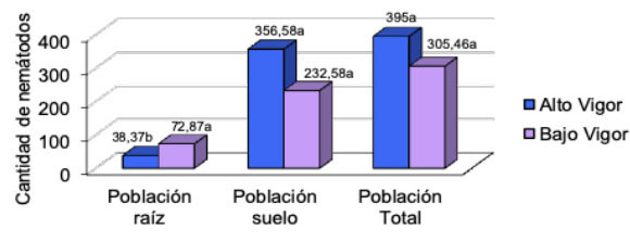 Figure 2. Population of phytopathogenic nematodes quantified in batches of high and low-vigor plantain (Musa AAB cv. Hartón) plants, in the south of lake Maracaibo, Venezuela. 2018.