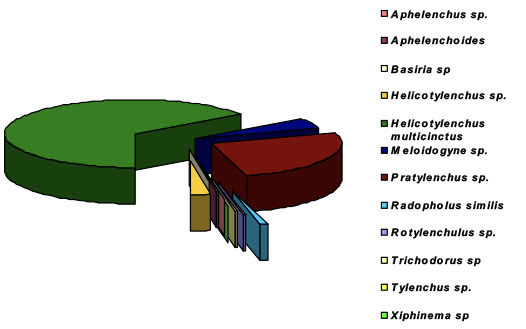 Figure 3. Taxonomic genera that make up quantified phytopathogenic nematode populations on plantain (Musa AAB cv. Hartón) plantations in the south of lake Maracaibo, Venezuela. 2018.