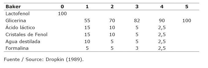 Se realizaron montajes de láminas permanentes por el método rápido de Baker (Jacob & Van-Bezooijen, 1971), el cual consiste en colocar el nemátodo (juvenil de segundo estado) en láminas cavadas con una gota de lactofenol, a una temperatura entre 60 y 70 °C en baño de vapor seco durante 3 h. Con este mismo proceso se pasó de manera consecutiva por cinco soluciones más, cada una durante 3 h (Cuadro 1).