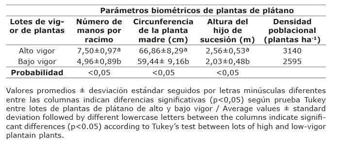 Se observó que el número de manos por racimo, la circunferencia de la planta madre (cm) y la altura del hijo de sucesión (m), fueron significativamente (p<0,05) más altos en lotes de plantas de plátano de alto vigor (AV) con respecto a los de bajo vigor (BV). Asimismo, al realizar la estimación de la densidad de plantas por hectáreas se reflejó una tendencia mayor en lotes de alta producción (Cuadro 2).