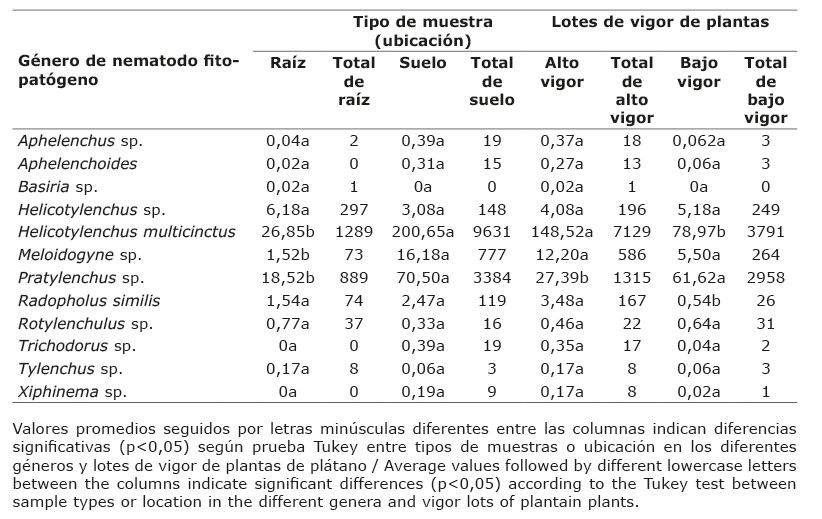 En lotes con plátano de alto vigor se identificaron los géneros: Helicotylenchus multicinctus, y Radopholus similis, y en lotes de bajo vigor: Pratylenchus sp.