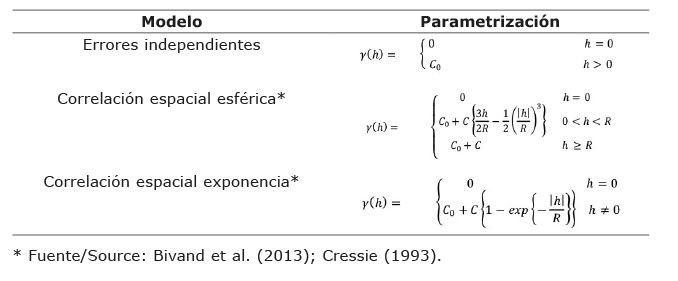Para estimar los parámetros de correlación espacial del ensayo en blanco, a los datos se les ajustó dos de los modelos de correlación espacial más utilizados: exponencial y esférico (Bivand et al., 2013; Cressie, 1993), además del modelo que supone errores independientes (Cuadro 1).