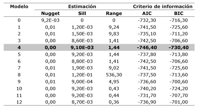 - Modelo 10: correlación espacial exponencial, sin efecto nugget y sin tendencia.