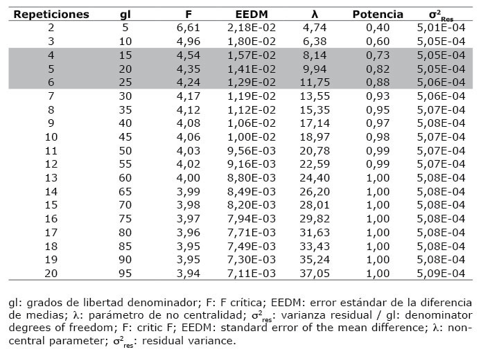 Con cinco repeticiones se alcanzó una potencia del 82 %. Las estimaciones de potencia presentadas, debido a la metodología utilizada, fueron invariantes desde el punto de vista práctico a la cantidad de tratamientos en cuestión. El número de tratamientos igual a 5 tuvo influencia únicamente en el tamaño de los campos aleatorios simulados. El Cuadro 3 presenta los resultados de la estimación de la potencia para el distinto número de repeticiones.