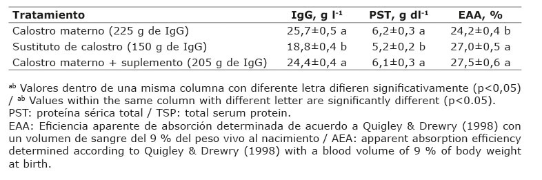 La concentración de IgG varió significativamente (p<0,05) entre tratamientos entre 18,8 y 25,7 g l-1. La eficiencia aparente de absorción (EAA) presentó diferencias significativas (p<0,05) entre tratamientos y varió entre 24,2 y 27,5 %.