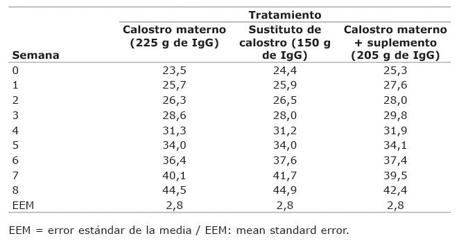 La altura a la cruz más baja se reportó al nacimiento para el tratamiento de reemplazador de calostro y la más alta en la semana ocho para el tratamiento calostro materno + suplemento de calostro, pero sin diferencias significativas (p>0,05) entre tratamientos (Cuadro 5).