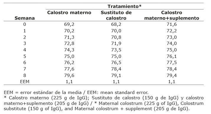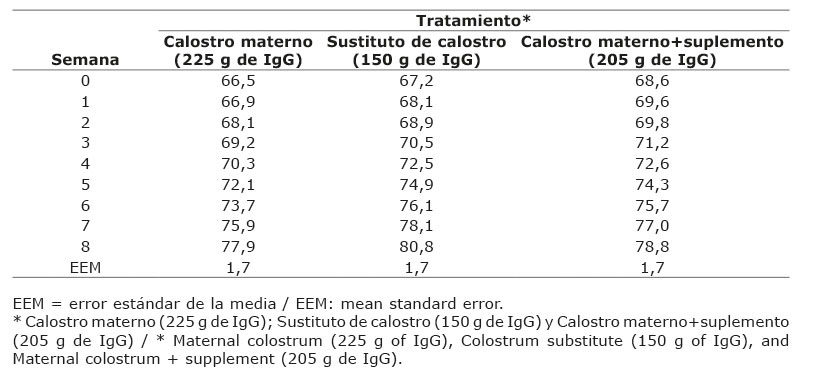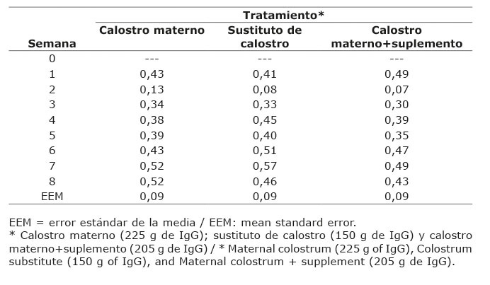 No se encontraron diferencias significativas (p>0,05) entre los diferentes tratamientos para la ganancia diaria de peso. El valor más bajo se presentó en la semana dos para el tratamiento de calostro materno+suplemento y la más alta en la semana siete para el tratamiento de reemplazador de calostro (Cuadro 3).