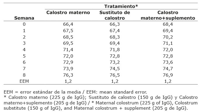 Los animales se pesaron al nacimiento antes de suministrar los tratamientos y esta medida se utilizó para determinar la eficiencia aparente de absorción (EAA), que se calculó como los gramos de IgG absorbidos en la circulación sanguínea (estimando el volumen de plasma en 9 % del peso al nacimiento), dividido entre los gramos de IgG consumidos, de acuerdo a la siguiente fórmula: EAA (%) = (IgG en suero (g)/consumo de IgG (g)) x 100 (Quigley & Drewry, 1998).