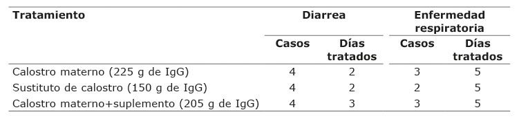 Los tratamientos utilizados fueron: a) tres litros de calostro materno (para un total de 225 g de IgG) b) 335 g de sustituto de calostro comercial (150 g de IgG) y c) dos litros de calostro materno con la adición de 110 g de un suplemento de calostro comercial (para un total de 205 g de IgG).