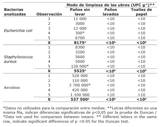 Los dos métodos utilizados para la limpieza de la ubre durante la desinfección de los pezones (presellado), garantizaron que las poblaciones de Escherichia coli, Staphylococcus aureus y aerobios totales al momento de la limpieza de la ubre durante el presellado, alcanzaran niveles menores a 10 UFCg-1.