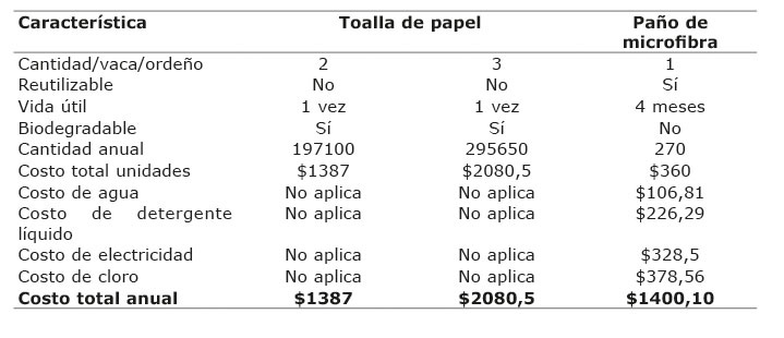 Al comparar el uso de toallas de papel contra el paño de microfibra para el secado de la ubre, se obtuvo una relación económica de 1:1 hasta 1,48 según el número hojas de papel que se utilicen en el secado de la ubre por año, a favor de los paños de microfibra, lo cual se relaciona a la vida útil del paño (25,71 %) y a las necesidades de agua (7,63 %), materiales desinfectantes (43,20 %) y la electricidad (23,46 %) durante cada ciclo de lavado (Cuadro 2).