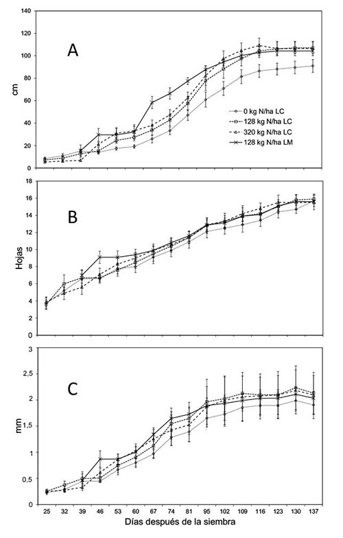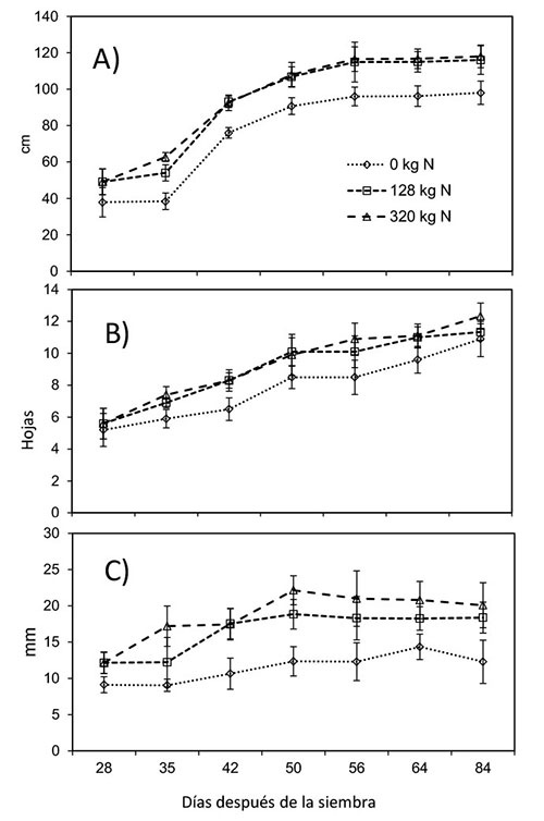 Durante el desarrollo del Experimento 1, se escogieron diez plantas representativas de los tratamientos 0, 128 y 320 kg N ha-1, cada semana se les midió el crecimiento expresado como altura, número de hojas y diámetro de la base del tallo. Lo mismo sucedió en el Experimento 2, aunque adicionalmente se incluyó el tratamiento de 128 kg N ha-1 LM.