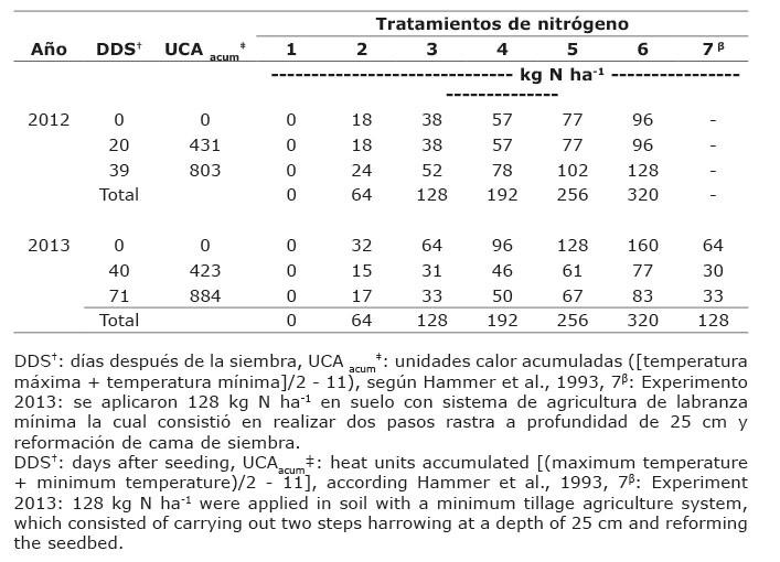 Table 1. Rates and nitrogen scheduling in sorghum (Sorghum bicolor L. Moench) grain crop, during the summer of 2012 and the spring of 2013, in the Mexicali Valley, Baja California, Mexico.