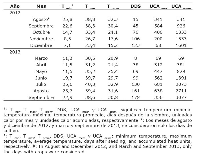 Las condiciones de temperatura días después de la siembre (DDS), unidades de calor por mes (UCA mes) y unidades de calor acumuladas (UCA acum), ocurridas durante los periodos de los experimentos 1 y 2, se presentan en el Cuadro 2. Las temperaturas ocurridas durante el Experimento 1, fueron en orden decreciente, iniciaron con mínimas de 25,8 °C y finalizaron con 7,1 °C. Mientras que las temperaturas máximas fueron de 38,8 °C a 23,4 °C. Lo mismo sucedió con las temperaturas promedio, iniciando con 32,3 °C y finalizando con 15,2 °C. Durante el Experimento 1, la cosecha se realizó a los 123 DDS y se acumularon un total de 1601 UCA acum (Cuadro 2).