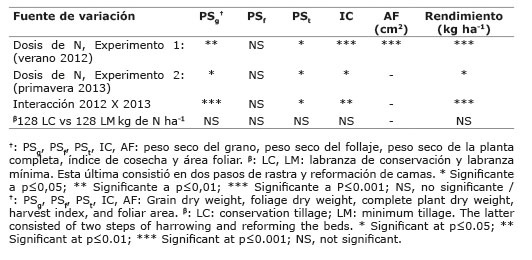 Durante el Experimento 2, el PSg y PSt, obtuvieron los mayores valores a dosis de 256 kg N ha-1, mientras que el rendimiento de grano se incrementó conforme la dosis de nitrógeno aumentó, alcanzando valores de 1960 kg de grano ha-1 (320 kg N ha-1). El PSf y el IC, no mostraron respuesta a la aplicación de nitrógeno. Al comparar Experimento 1 (verano 2012) versus Experimento 2 (primavera 2013), se identificó un mayor PSg, PSt, IC y rendimiento en las plantas cultivadas durante el verano. Para el caso de la variable PSf no se encontró diferencia estadística entre años (p>0,05). Sin embargo, al comparar los dos sistemas de labranza 128 LC versus 128 LM kg de N ha-1, no se encontró respuesta significativa en ninguna de las variables evaluadas (p>0,05).