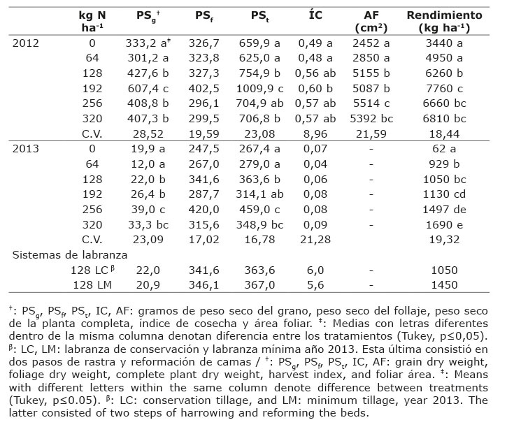 El Cuadro 3, muestra el análisis de varianza para las dosis de nitrógeno, la comparación entre los dos tipos de labranza, así como la interacción entre las estaciones del año. Se observa que durante el Experimento 1, el nitrógeno tuvo efecto significativo en el PSg, PSt, IC y el rendimiento de grano (p≤0,05). El mayor PSg, PSt, IC y rendimiento de grano se obtuvo con la dosis de 192 kg N ha-1 (Cuadro 4). En cambio, el AF alcanzó su mayor valor a la dosis de 256 kg N ha-1. Por otro lado, el PSf no resultó afectado por ninguna de las dosis evaluadas (p>0,05).