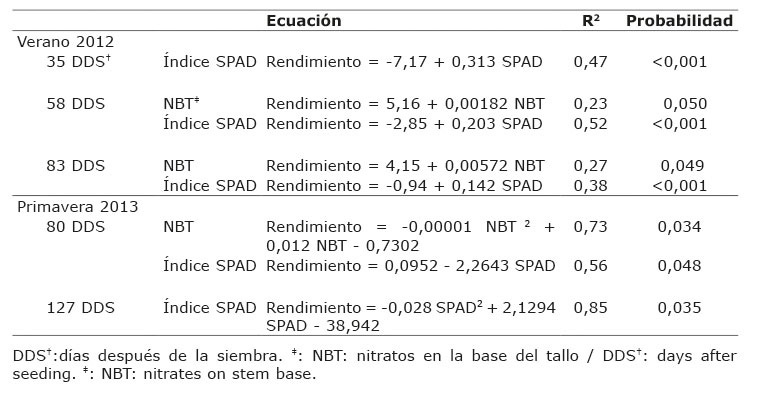 Table 5. Relationship between the NBT concentration and the SPAD index and the yield of the grain sorghum (Sorghum bicolor L. Moench) (summer 2012 and spring 2013), in the Mexicali valley, Baja California, México.