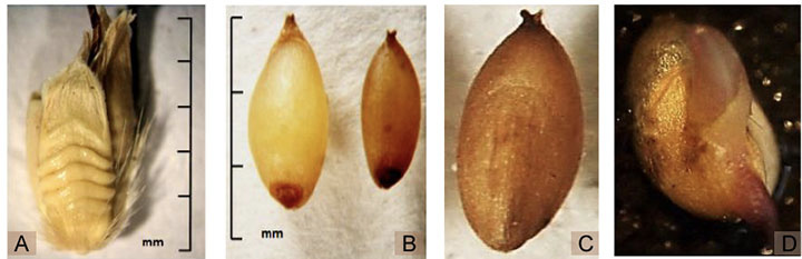 Figure 1. Dispersal unit of I. rugsosum Salisb. 40x A) Spikelet, B) two different caryopsis located in each dispersal unit, one large and the other small, C) carypside dorsal part, D) emergency start of radicle. Laboratorio Oficial de Análisis de Calidad de Semillas del Centro para Investigaciones en Granos y Semillas (CIGRAS) de la Universidad de Costa Rica. San José, Costa Rica, 2015.