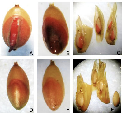 Figure 2. Staining of the propagating units of I. rugosum Salisb. after undergoing the tetrazolium test. A) Large caryopside stored at 23.9 °C (40 x), B) small caryopside stored at 23.9 °C (40 x), C) spikelet stored at 23.9 °C (20 x), D) large caryopsis stored at 5 °C (40 x), E) small caryopsis stored at 5 °C caryopsis (40 x), F) spikelet stored at 5 °C (20 x). Laboratorio Oficial de Análisis de Calidad de Semillas del Centro para Investigaciones en Granos y Semillas (CIGRAS) de la Universidad de Costa Rica. San José, Costa Rica, 2015.