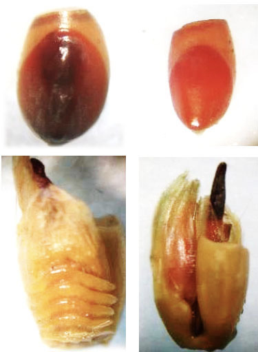 Tras cumplirse el periodo de reposo se procedió a realizar el corte a las semillas (tanto las que se embebieron como las que no), el corte en la cariópside se hizo en la parte superior de esta y se hizo de forma trasversal, se seccionó 1/3 del endospermo; mientras que en la espiguilla el corte se hizo de forma transversal en 3/5 de la misma en la parte inferior que corresponde a una fracción de la base, la cual es una sección que se encuentra endurecida. Para realizar el corte se empleó un bisturí de laboratorio.