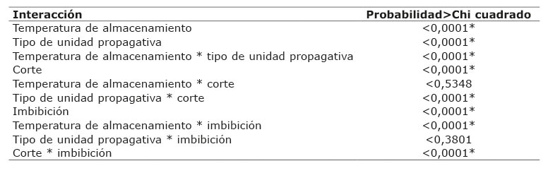 El análisis indicó que hubo interacción doble significativa entre temperatura de almacenamiento y tipo de unidad propagativa (p<0,0001), tipo de unidad propagativa y corte (p<0,0001), temperatura de almacenamiento e imbibición (p<0,0001) y corte e imbibición (0,0001) (Cuadro 1).