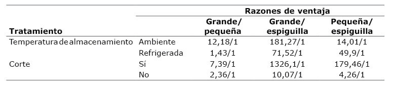 En la interacción temperatura de almacenamiento y unidad propagativa, las cariópsides grandes mostraron una mayor ventaja de tinción con respecto a las cariópsides pequeñas y la espiguilla, igualmente, las cariópsides pequeñas tuvieron mayor ventaja sobre la espiguilla, esta ventaja fue superior en las semillas que provinieron del almacenamiento a temperatura ambiente en comparación a las de temperatura refrigerada. Cuando se empleó semilla de la condición de temperatura refrigerada, la cariópside grande mostró un 43 % más de tinción que la cariópside pequeña, lo cual sugiere que la semilla de la cariópside grande tuvo mayor viabilidad que la pequeña. En la interacción tipo de unidad propagativa y corte, para el tipo de unidad propagativa ocurrió lo mismo que se describió anteriormente, aunque en este caso al utilizar semilla con corte hubo mayor ventaja de tinción (Cuadro 2) (Figura 2).