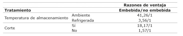 En el caso de la interacción temperatura de almacenamiento e imbibición, hubo una mayor ventaja para las semillas que se almacenaron a temperatura ambiente y se embebieron, la cual fue de 41,26 contra 1; este efecto de la imbibición también fue mayor con respecto a la semilla refrigerada. Para la interacción corte e imbibición también existió una mayor ventaja al someter la semilla a imbibición, y hubo una mayor tinción al emplear semilla con corte (Cuadro 3) (Figura 3).