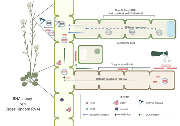 Figurea 3. Movilización de ARNi en el sistema vascular de la planta. El ARNi puede moverse entre las células a través de los plasmodesmatos y el haz vascular y ser usado en los exosomas para la defensa contra los patógenos. Obsérvese la proteína TET9 y TET8, clave en la movilización de la defensa del exosoma. Creado con BioRender.com.
