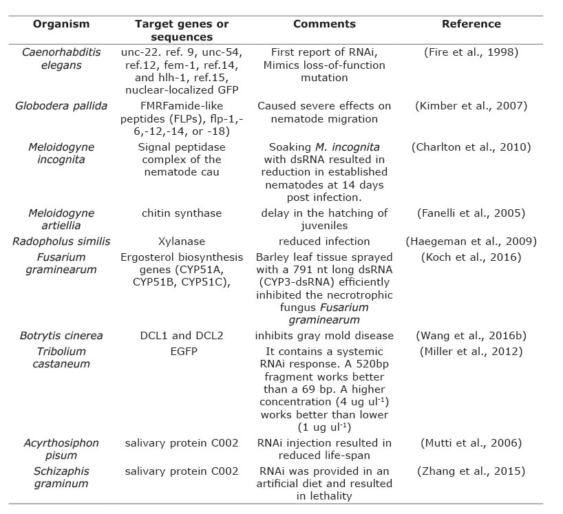 The external application or spray dsRNA triggers the RNAi system creating a pest-specific control method. Such application is becoming an important global trend in the use of novel biopesticide (Table 1) (Mat-Jalaluddin et al., 2019). The external RNAi is known to be useful to control pests such as nematodes (Koch & Kogel, 2014; Lilley et al., 2012), arthropods such as Drosophila melanogaster, Tribolium castaneum (Yu et al., 2013), fungi such as Sclerotinia sclerotiorum and B. cinereal (McLoughlin et al., 2018b), and aphids such as the pea aphid Acyrthosiphon pisum and Greenbug Schizaphis graminum, targeting in both cases the salivary protein C002 (Yu et al., 2016). For example, the topical application of dsRNA to the surface of barley (Hordeum vulgare L.) leaves resulted in reduced growth of the pathogen Fusarium graminearum. In this case, the dsRNA targets the genes of fungal cytochrome P450, lanosterol and C-14α demethylases. All of them required for fungal ergosterol biosynthesis and resulted in 50 % decrease of the corresponding transcript (Koch et al., 2016). Long dsRNA require processing by internal fungi Dicer like protein 1 (DCL1) in order to be active (Koch et al., 2016; Wang et al., 2016a; Wang & Jin, 2017). Another example was with the fungi Botrytis cinerea using dsRNA targeting DCL1 and DCL2 simultaneously (Wang et al., 2016b). Double-stranded RNA can become an important tool in the control of both Sclerotinia sclerotiorum and Botrytis cinerea fungi (McLoughlin et al., 2018b).