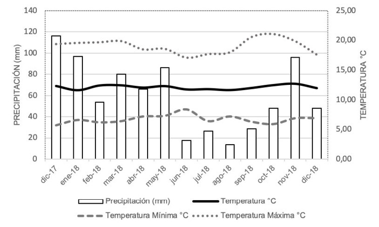 Figure 1. Accumulated rainfall and temperature from December 2017 to December 2018, Vintage station pro 2, located at the Obonuco research station of the Colombian Agricultural Research Corporation (AGROSAVIA). Pasto, Colombia.