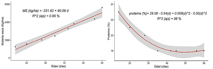 El mayor rendimiento de materia seca se obtuvo a los 60 días de edad y el mayor porcentaje de proteína se obtuvo a los 14 días aproximadamente. Se registraron tasas de crecimiento (MS kg ha-1 día-1) para la M1 (Figura 2), M2 (Figura 3), M3 (Figura 4), M4 (Figura 5), M5 (Figura 6) y M6 (Figura 7) a la edad de 35 días de 25,62; 24,49; 5,37; 29,67; 24,34 y 18,90, y a los 42 días de 28,46; 29,61; 29,07; 30,54; 26,98 y 22,33, respectivamente, el porcentaje de proteína para las mismas edades fue de 18, 20, 20, 25,16,16 y 15, 21, 21, 25, 16 y 14, respectivamente. La mezcla que obtuvo la mayor tasa de crecimiento y el mejor porcentaje de proteína fue la M4.