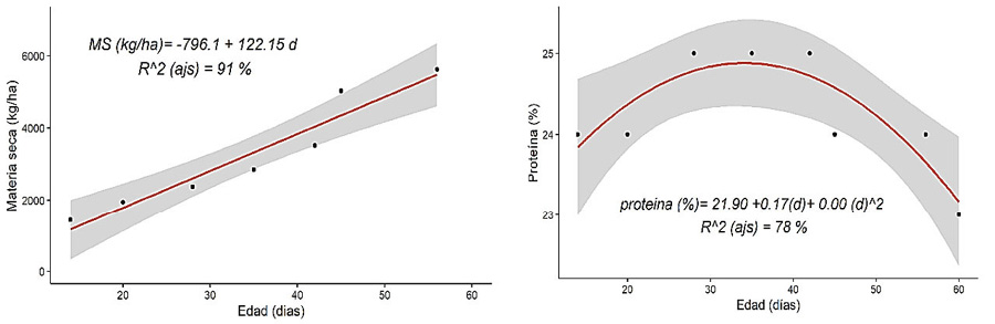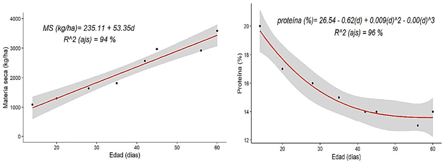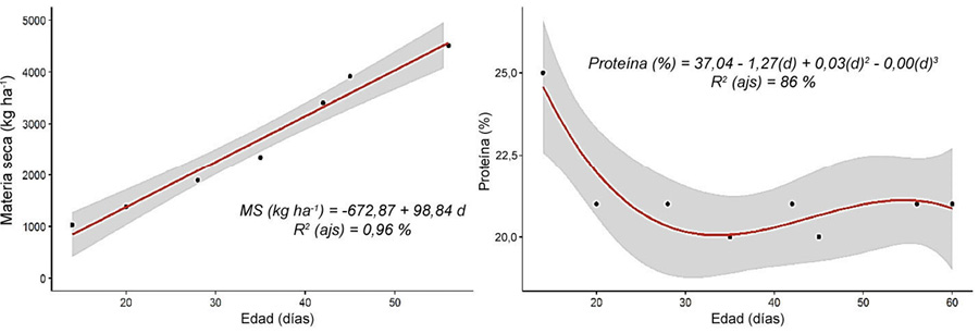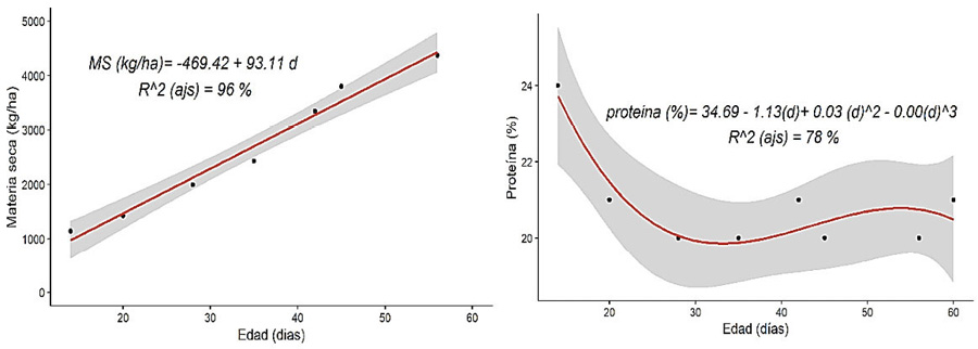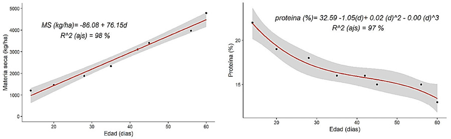 Cuando fue significativa la diferencia entre los tratamientos, se utilizó la prueba de comparación de medias de Tukey (p<0,05), la dinámica de crecimiento para la variable MS se analizó a través de regresiones lineales utilizando un modelo lineal Y= α+βx donde Y= rendimiento de forraje (MS); α= coeficiente o intersección con el eje de ordenadas; β= coeficiente de regresión; x= tiempo en días. La variable de calidad nutricional PC se analizó siguiendo el mismo criterio utilizando modelos cuadráticos y cúbicos.