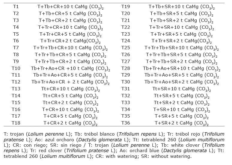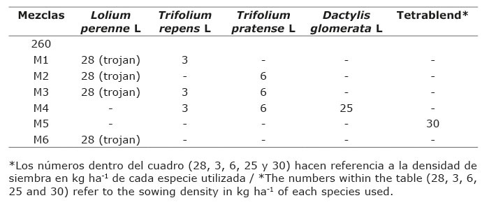 Se establecieron seis mezclas compuestas por las gramíneas trojan (Lolium perenne L), tetrablend 260 (30 % de raigrás anual tetraploide + 50 % de raigrás híbrido tetraploide + 10 % de azul orchoro y 10 % de trébol rojo), azul orchoro (Dactylis glomerata L), con las leguminosas trébol white gold (Trifolium repens L) y trébol red gold (Trifolium pratense L), Tres niveles de enmienda 10, 5 y 2 t ha-1 CaMg (CO3)2 y dos láminas de riego, teniendo en cuenta la evapotranspiración de referencia (Eto) del sitio evaluado (Allen et al., 2006).