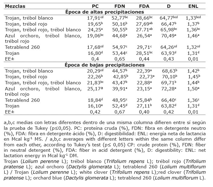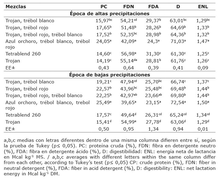 No se presentaron diferencias estadísticas entre las interacciones de tres y dos factores, por lo cual se analizó el efecto de los factores principales por separado, donde el factor mezcla presentó diferencias significativas (Cuadro 5). Los mejores valores para las variables PC, D y ENL, para la época de altas precipitaciones los presentó la mezcla azul orchoro, trébol blanco y trébol rojo, con 22,95, 69,18 y 1,43, respectivamente. Para la época de bajas precipitaciones la misma mezcla mostró los mejores resultados con 26,74, 73,87 y 1,54 respectivamente. Las variables FDN y FDA se mostraron en mayor contenido en ambas épocas en el riegrás Trojan con 57,29, 31,03, 53,71 y 27,80, respectivamente.