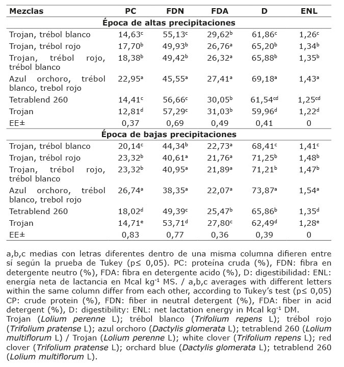 La mezcla con leguminosas mejoró el porcentaje de proteína cruda en las dos épocas evaluadas (Cuadro 3), si se tiene en cuenta que el valor obtenido en este parámetro por el pasto Trojan (16,8 y 16,1 %) fue inferior con comparación por las demás mezclas. Sin embargo, cuando este se mezcló con trébol rojo y blanco mejoró esta fracción en las dos épocas evaluadas (24,2 y 21,8 %). En dos pisos altitudinales de Cantón, Loja (Ecuador) el valor nutritivo de las mezclas compuestas por raigrás inglés más trébol blanco; pasto azul más trébol blanco y raigrás inglés más pasto azul más trébol blanco, mostraron valores de PC de 15,1, 15 y 15,9 %, respectivamente, lo cuales fueron inferiores a los obtenidos en el presente estudio. Las cifras más altas en este estudio podrían obedecer a la adición de cal agrícola y la preparación previa al rebrote de las mezclas (Maza-Chamba, 2015).