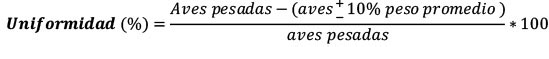 Para obtener los diferentes indicadores de producción, se registraron los rendimientos productivos de las aves por lote y por semana. Los indicadores evaluados fueron el peso corporal, el porcentaje uniformidad del peso, el consumo de alimento, el desperdicio de alimento, la producción diaria y semanal, masa de huevo, el peso de huevo, conversión alimenticia hasta la semana setenta, mientras que el indicador de huevos por ave alojada, porcentaje de mortalidad, producción y aves descartadas se registró hasta la semana ochenta de edad de las aves. Para obtener el peso de las aves, se realizó el pesaje individual una vez por semana, a partir de la semana veinte hasta la setenta, con una balanza digital con capacidad de 45 kg y una precisión de 0,4 % de la carga aplicada. Se tomó una muestra aleatoria equivalente al 30 % de las aves de cada lote. Con este indicador se obtuvo la curva de peso de las aves y el porcentaje de uniformidad de la parvada en cada lote (ecuación 1).
