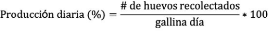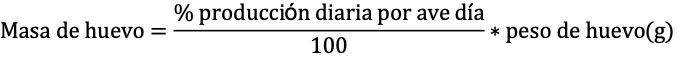 El pesaje de los huevos se efectuó una vez a la semana, con una muestra aleatoria de treinta huevos recién recolectados por lote, con una balanza analítica con ±0,01g de precisión. A partir del peso promedio de huevo de cada lote y del número de huevos, durante la semana treinta hasta la setenta de edad del ave, se calculó el porcentaje de producción diaria y producción semanal (ecuación 2), la cantidad de huevos por ave alojada (ecuación 3), la masa de huevo (ecuación 4), la conversión alimenticia ontotal y la conversión alimenticia real.
