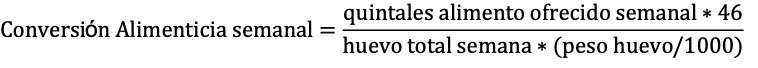 Se calculó la conversión alimenticia total semanal y la conversión alimenticia real en el periodo que comprendió la semana veintiocho hasta la setenta, para lo cual se utilizó el alimento ofrecido y el alimento consumido real, el cual correspondió al alimento ofrecido menos el alimento consumido. La diferencia entre ambos correspondió al porcentaje de desperdicio de alimento. Para el cálculo de la conversión alimenticia real (ecuación 5) se contempló las aves muertas hasta el momento y el consumo real diario, mientras que la conversión alimenticia total semanal (ecuación 6) no tomó en cuenta las aves muertas o descartadas y se utilizó la cantidad de quintales (46 kg) de alimento balanceado semanales ofrecidos sin considerar el desperdicio de alimento.