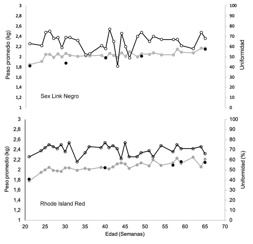 Figure 1. Average body weight (kg) and weight uniformity percentage of Sex Link Black and Rhode Island Red hens in a floor production system with access to grazing. Cartago, Costa Rica. 2018.