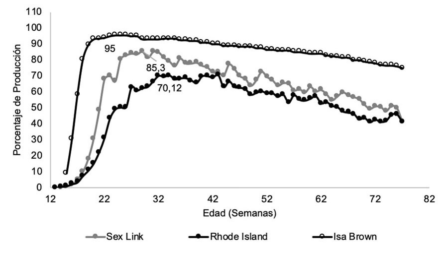 Los pesos y uniformidades menores en la semana 27 se asociaron con un evento de cama húmeda registrado, debido al mal funcionamiento de un bebedero y que generó fuertes olores por altos niveles de amoniaco. En la semana 59 de edad de las aves se registraron altas temperaturas ambientales y humedades relativas, 30°C y 100 %, respectivamente. Estas condiciones generaron estrés calórico en las aves, se redujo el consumo de alimento balanceado y se exacerbó el comportamiento de picaje y canibalismo (Shimmura et al., 2008). La baja persistencia de la postura, bajos porcentajes de producción diaria y huevos por ave alojada (Calik, 2014; Dominant CZ, 2015; Silversides et al., 2007; Singh et al., 2009) menores a los esperados. Las razas de gallinas Rhode Island Red y el cruce Sex Link Negro, se asociaron a un manejo inadecuado durante la crianza, por la gran variabilidad en los pesos corporales y en el porcentaje de uniformidad al alcanzar la madurez sexual. El efecto del sistema de crianza puede provocar un desarrollo sub-óptimo del sistema inmune, digestivo, muscular, óseo y reproductivo de las aves (Hy-line, 2020). Esto hace que un grupo de gallinas empiece la postura antes o después de la edad esperada, lo que provoca variaciones en la producción de huevo (Hudson et al., 2001). Situación que se prolonga en el período de transición a la postura y puede resultar en un pico de postura bajo y mala persistencia de producción (Hy-line, 2020). En este trabajo el pico de producción se alcanzó a edades mayores, debido a la baja uniformidad de la parvada (Hudson et al., 2001).