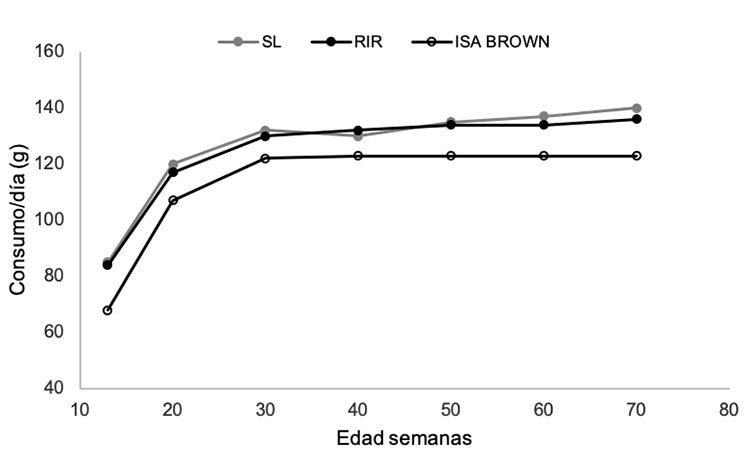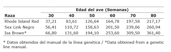 El consumo de alimento observado para ambos grupos de aves, fue mayor que el esperado para las gallinas Isa Brown (Figura 3). Fue posible observar (Cuadro 2) gran desperdicio de alimento, presente en la cama bajo los comederos, en los dos grupos de gallinas, mayor en las aves RIR conforme aumentó la edad.