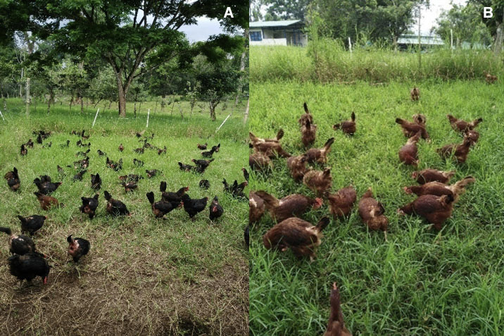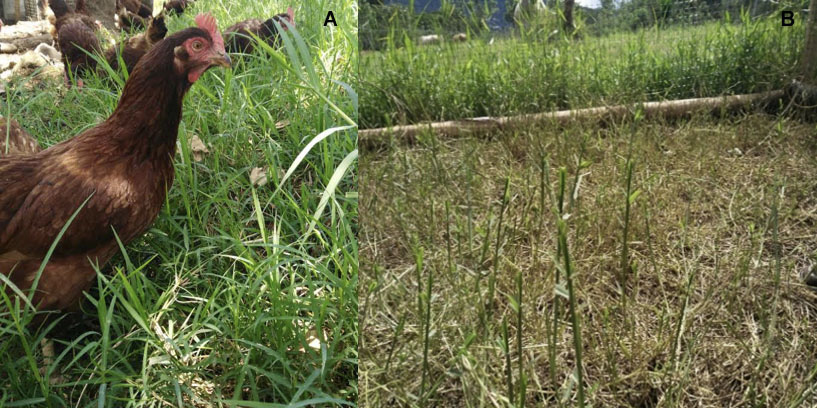 Figure 5. Leaf intake of the African star grass (Cynodon nlemfuensis) by RhodeIsland Red hens in a production system with access to grazing. Pre (A) and post (B) grazing. Cartago, Costa Rica. 2018.