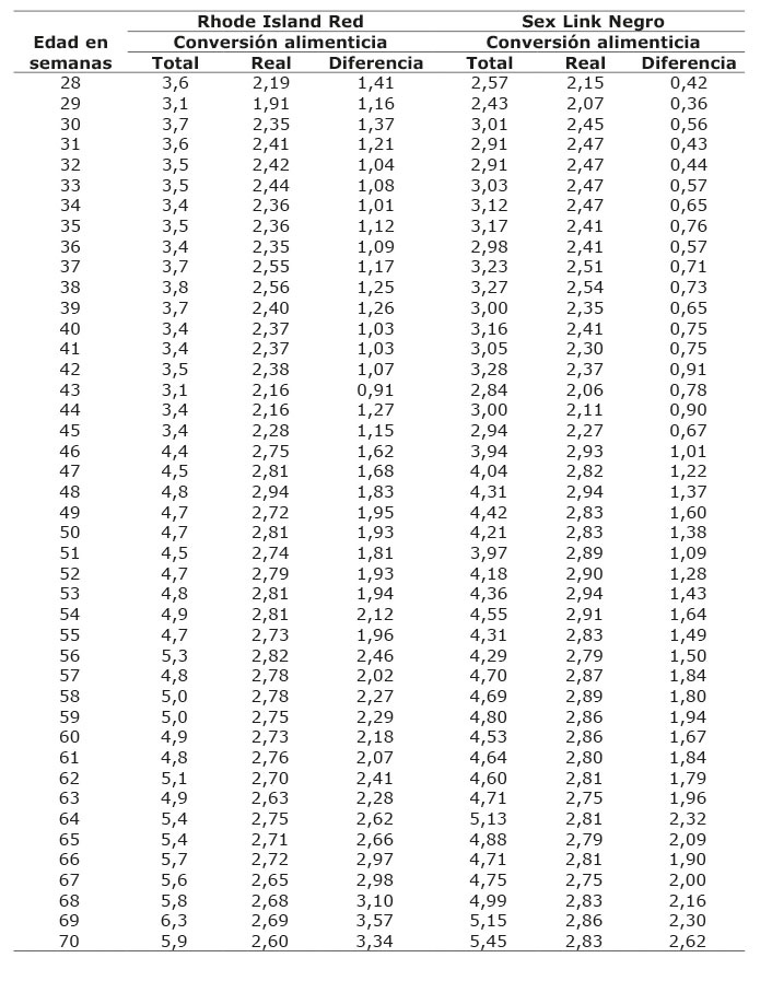 La conversión alimenticia real para ambos grupos de gallinas fue mayor que el esperado para las gallinas Isa Brown (ISA Brown, 2020) y más alta que la descrita por Calik (2014) para gallinas RIR. La conversión real fue menor a la encontrada por Singh et al. (2009) a las 30 y 40 semanas para gallinas SLN y mayor a las 50 semanas de edad.