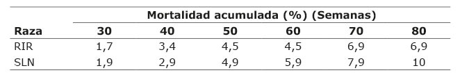 El porcentaje de mortalidad y el descarte de gallinas durante todo el período de observación fue mayor para las gallinas SLN que para las RIR (Cuadro 3). La principal causa de muerte fue picaje y canibalismo dentro de las instalaciones y descarte de gallinas pequeñas, subordinadas y maltratadas en ambos grupos. Las gallinas SLN mostraron mayor agresividad que se manifestó en comportamiento de picaje y canibalismo conforme aumentó la edad.