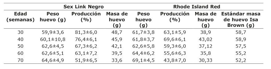 El peso de huevo fue mayor para las gallinas RIR que para las aves SL durante todas las semanas de observación (Cuadro 4). El peso de huevo de las gallinas RIR también fue mayor que el recomendado para la línea genética Isa Brown. La masa de huevo de ambos grupos de gallinas durante todo el período de observación, fue menor a la esperada para las gallinas Isa Brown. La masa de huevo de las aves RIR fue menor que la observada en las gallinas SLN, debido al menor porcentaje de producción de huevos puestos por estas aves.