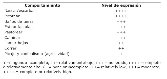Se observaron los comportamientos de rascar/escarbar (movimiento con las patas y garras en hojas y en el suelo), picotear (movimientos directos con el pico a diferentes objetos), baños de tierra, estirar las alas, pastorear (ingerir materia verde y/o insectos), caminar, lamer hojas, correr, picaje [comportamiento de picotear las plumas de otra ave (Fijn et al., 2020)] y canibalismo. En el caso de estos dos últimos comportamientos, la combinación de ambos se asoció a la agresividad del ave. Además, se prestó atención a la presentación de nuevos comportamientos, que el acceso a pastoreo pudiera estimular en las aves; para tal fin, se registró la cantidad de veces que las gallinas realizaban cada comportamiento y se obtuvo el porcentaje de cada uno al dividir cada comportamiento realizado entre el total de todas las observaciones registradas. La escala de calificación utilizada fue la siguiente: completo o relativamente alto= todas las aves lo realizaron; moderado= 50 a 80 % de las aves lo realizaron; relativamente bajo= menos del 50 % lo realizaron; ninguno o incompleto= no se observaron.