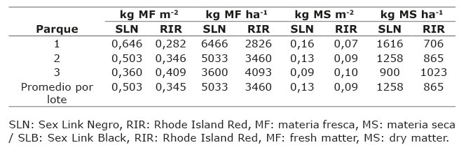 Se obtuvieron disponibilidades de forraje promedio del pasto Estrella Africana de 5033 y 3460 kg MF ha-1 para los parques de las aves SLN y RIR, respectivamente. Se obtuvo una relación hoja/tallo>1, lo que reflejó una mayor preferencia por las hojas de las gallinas al pastorear. La menor relación tallo/hoja fue de 1,0 en los parques de gallinas SLN y la mayor de 1,7 en los parques de las gallinas RIR. El material senescente no se cuantificó en ninguna muestra, debido a la baja rotación (15 días) que se realizó en los parques.