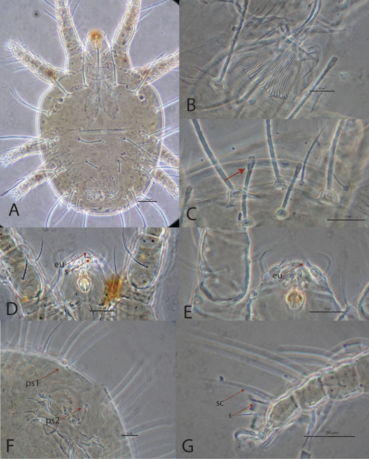 Figure 1.Raoiella indica Hirst.: A, Female dorsal habitus; B, face without shield; C, spatulate setae; D, palp with solenidium (s) and eupathidia (eu); E, segment of palp and eupathidia (eu); F, anal valve with ps1 and sp2 setae; G Tarso I with solenidium (s) and companion setae (sc). Colombian Agricultural Institute (ICA), Tolima. Colombia. 2019.