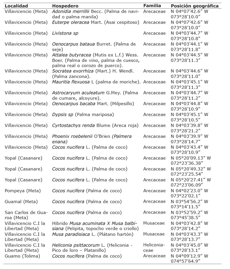 Las especies de plantas A. merrillii, C. nucifera, H. psittacorum, S. exorrhiza, M. flexuosa, Livistona sp., Dypsis sp., C. renda y P. roebelenii, se observaron con poblaciones en todos los estados morfológicos, junto con la presencia de síntomas característicos de daño, lo cual indica que son hospederos primarios de R. indica. Esta información concuerda con lo reportado por Carrillo et al. (2012b); Gómez et al. (2017), quienes propusieron estas mismas especies como hospederos primaros de R. indica. Los mismos autores mencionaron como hospederos secundarios a O. bacaba y M. paradisiaca, especies para las cuales también se encontraron poblaciones abundantes en este trabajo, sin observar oviposiciones en las colonias encontradas.