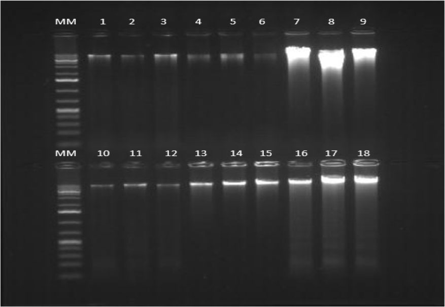 Figure 1. DNA isolated from Psidium guajava (2n= 22) samples by three extraction methods and two different types of tissue on 1 % agarose gel (m/v). MM: Molecular marker. 1, 2, 3: HF-MP, 4, 5, 6: HF-MQ, 7, 8, 9: HF-MC, 10, 11, 12: HL-MP, 13, 14, 15: HL-MQ, 16, 17, 18: HL-MC. Molecular Biology Laboratory, Estacion Experimental Agricola Fabio Baudrit Moreno, Universidad de Costa Rica. Alajuela, Costa Rica. 2020.